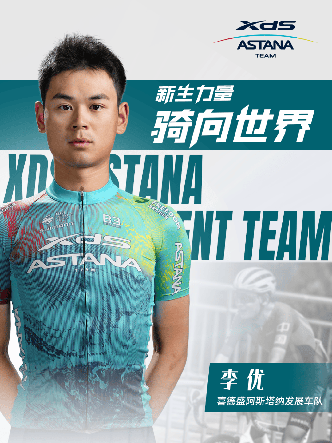 这位21岁的年轻车手身着喜德盛阿斯塔纳车队骑行服,脸上洋溢着梦想成真的激动与对新征程的期待。