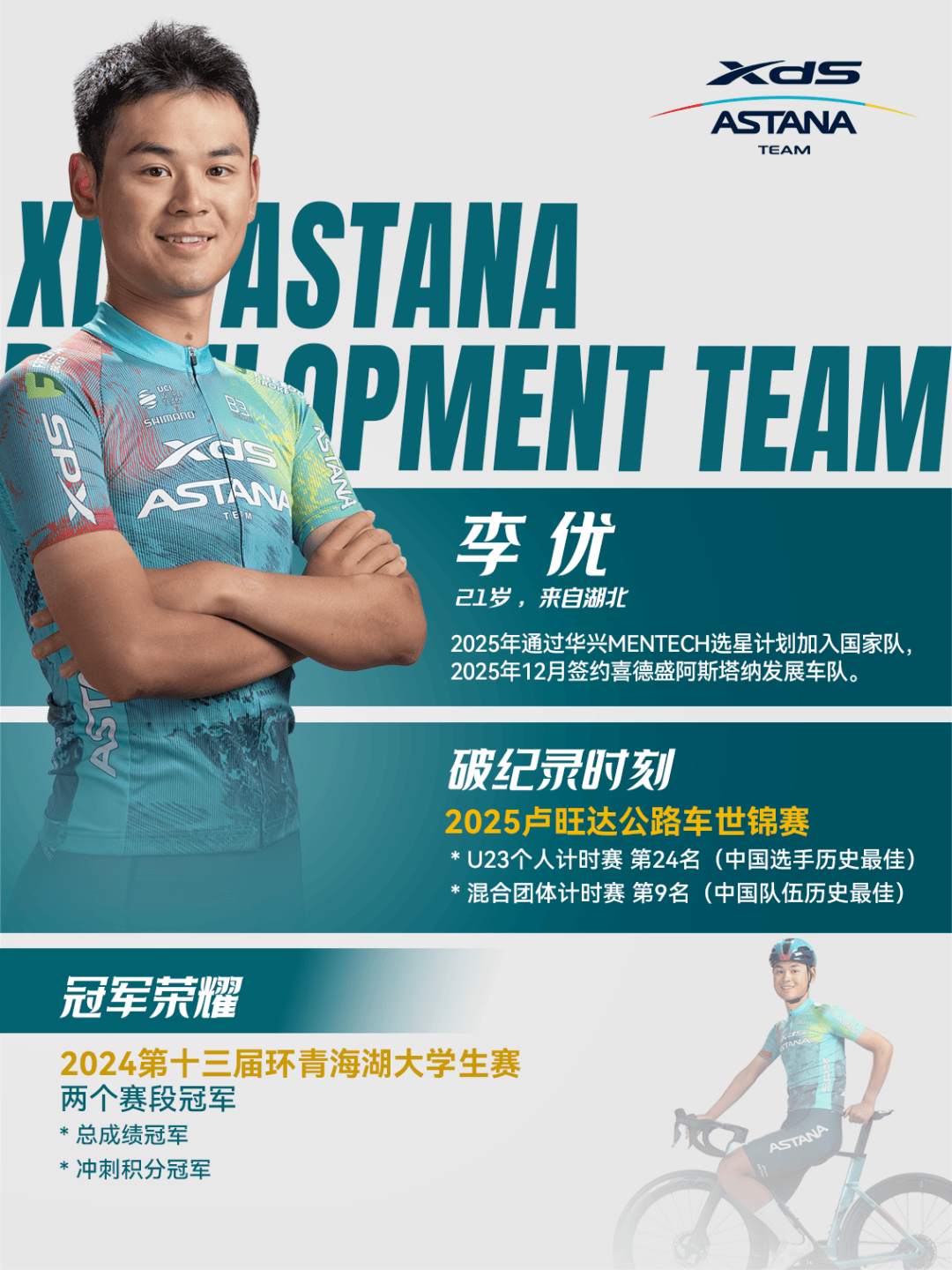 自2025年8月喜德盛“骑向世界”计划启动以来,经过严格选拔和为期15天的西班牙冬季训练营,李优凭借在训练营中总积分第一的优异成绩脱颖而出,赢得了这份宝贵的职业合约。在西班牙冬训营期间,他创下了全程零缺席的纪录,每日清晨准时开始训练,展现出职业车手应有的自律与专注。2025年卢旺达世锦赛上,李优在U23个人计时赛中获得第24名,在混合团体计时赛中帮助中国队获得第9名,创造了中国车队在该项目上的历史最佳成绩。