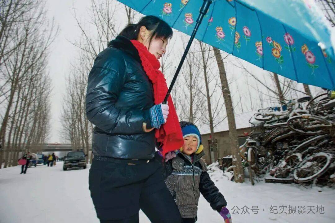 2013年2月5日,山东省临沂市沂水县圈里乡,妈妈一手撑着花伞,一手牵着娃,母子俩雪中逛集市。