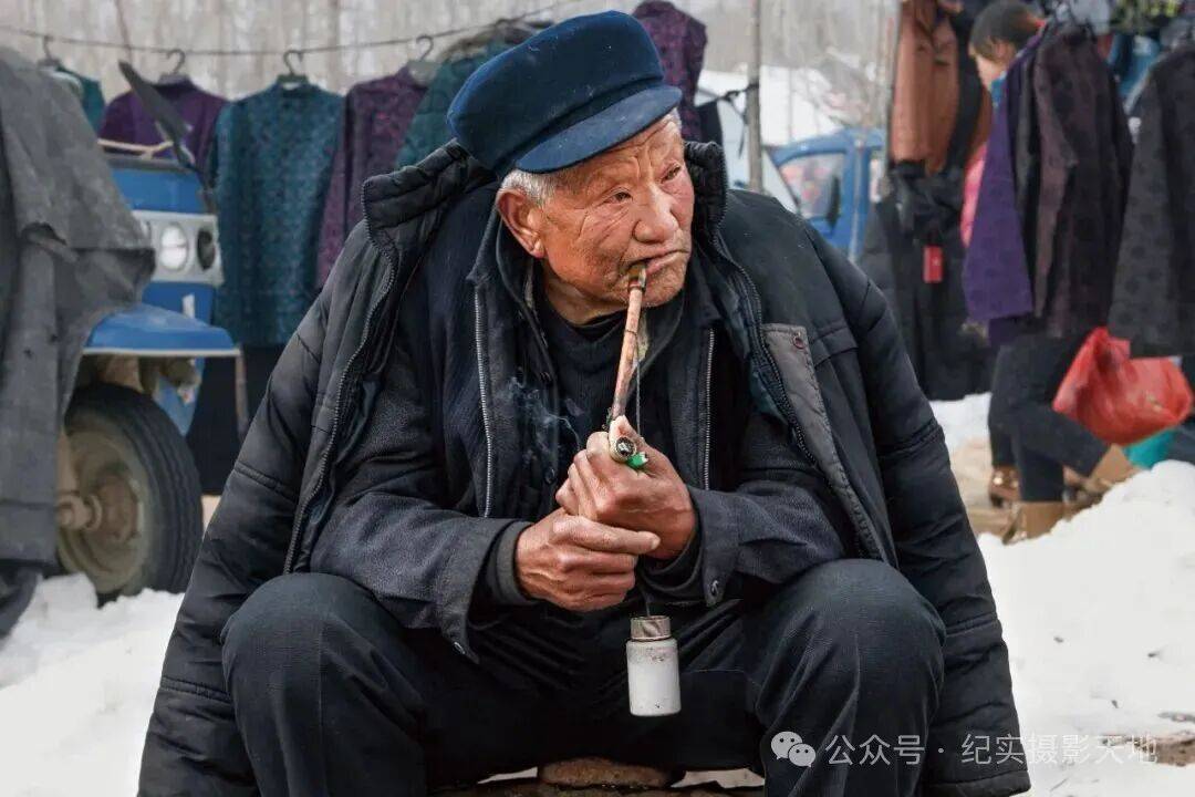 2013年2月6日,山东省临沂市沂水县高桥镇,老汉逛累了,坐在石头上抽着旱烟看热闹。