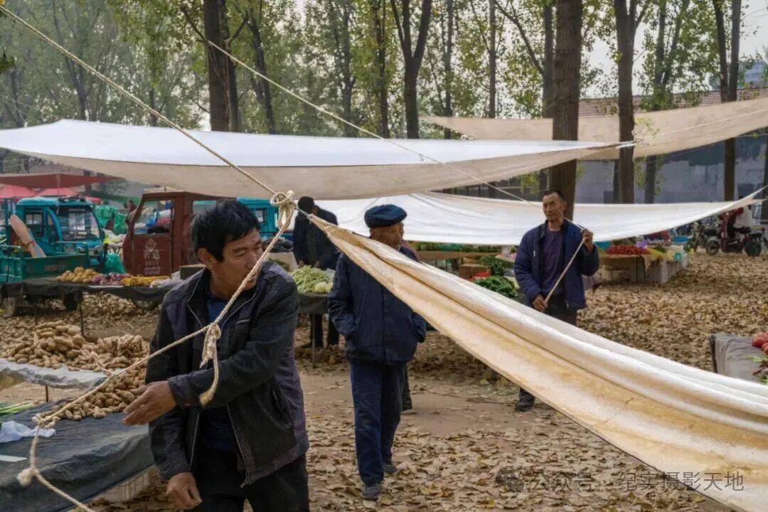 2023年11月30日,山东省临沂市沂南县苏村镇,骑自行车的逛客与身边的风景流动在篷布上,呈现如电影般的一幕又一幕画面。