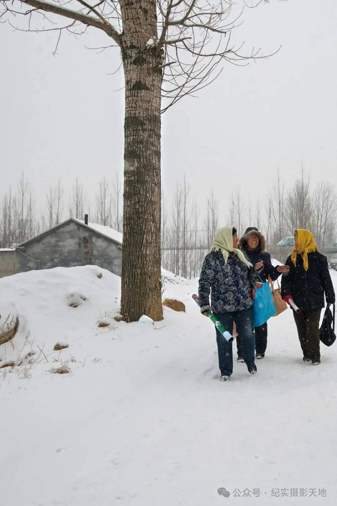 2013年2月5日,山东省临沂市沂水县圈里乡,老姐妹冒着雪花一路逛一路聊,不知不觉到了村头,热乎劲不减当年。