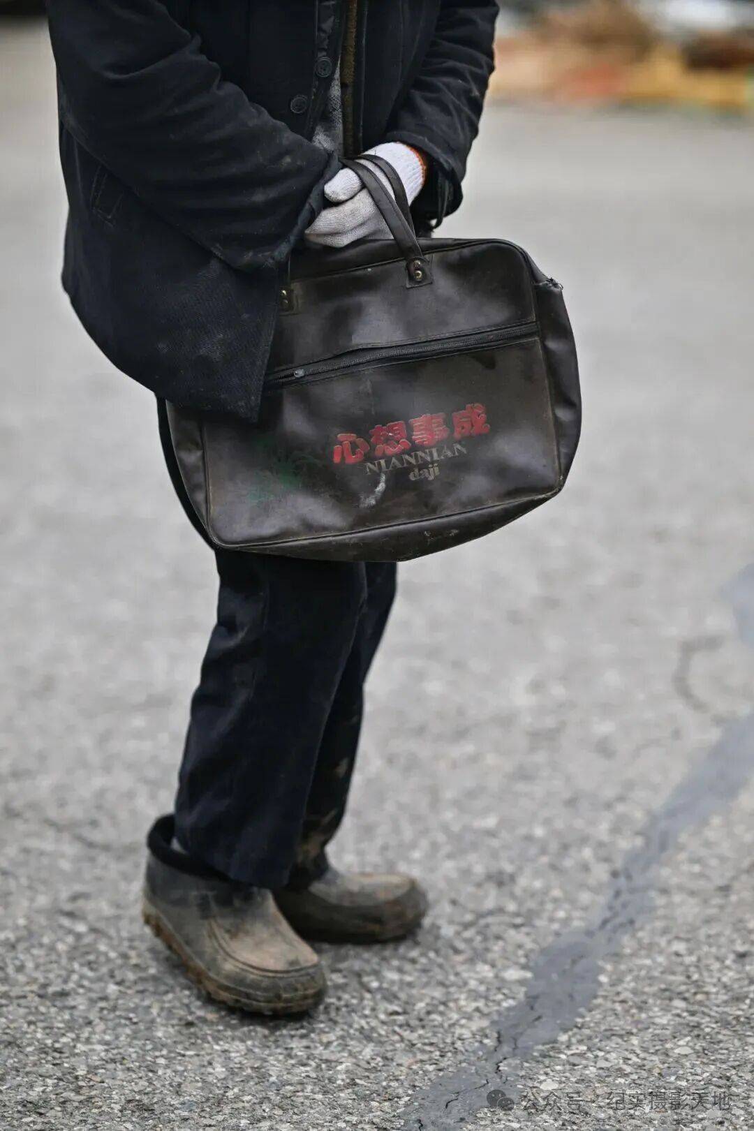 2023年12月13日,山东省临沂市沂水县高桥镇,戴着白手套的老逛客,每次逛街都要拿着用了半个多世纪的黑皮包。