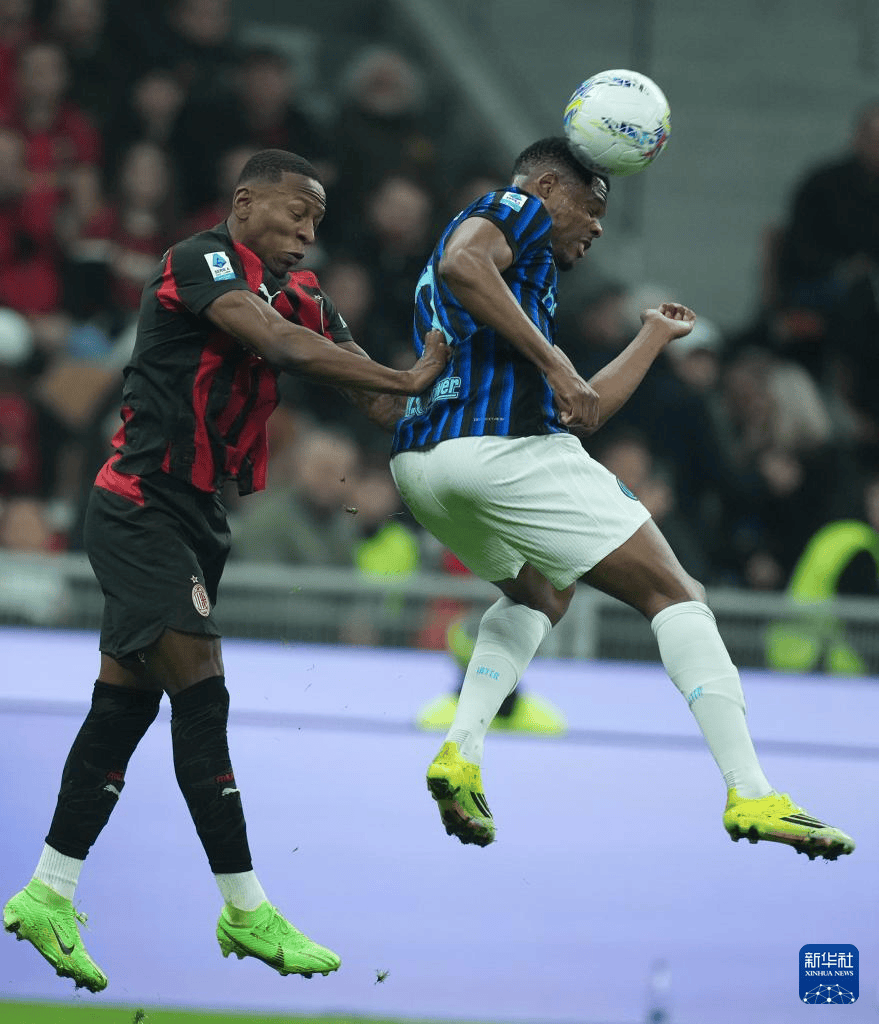 3月8日,AC米兰队球员埃斯图皮尼安(左)与国际米兰队球员邓弗里斯在比赛中争顶。