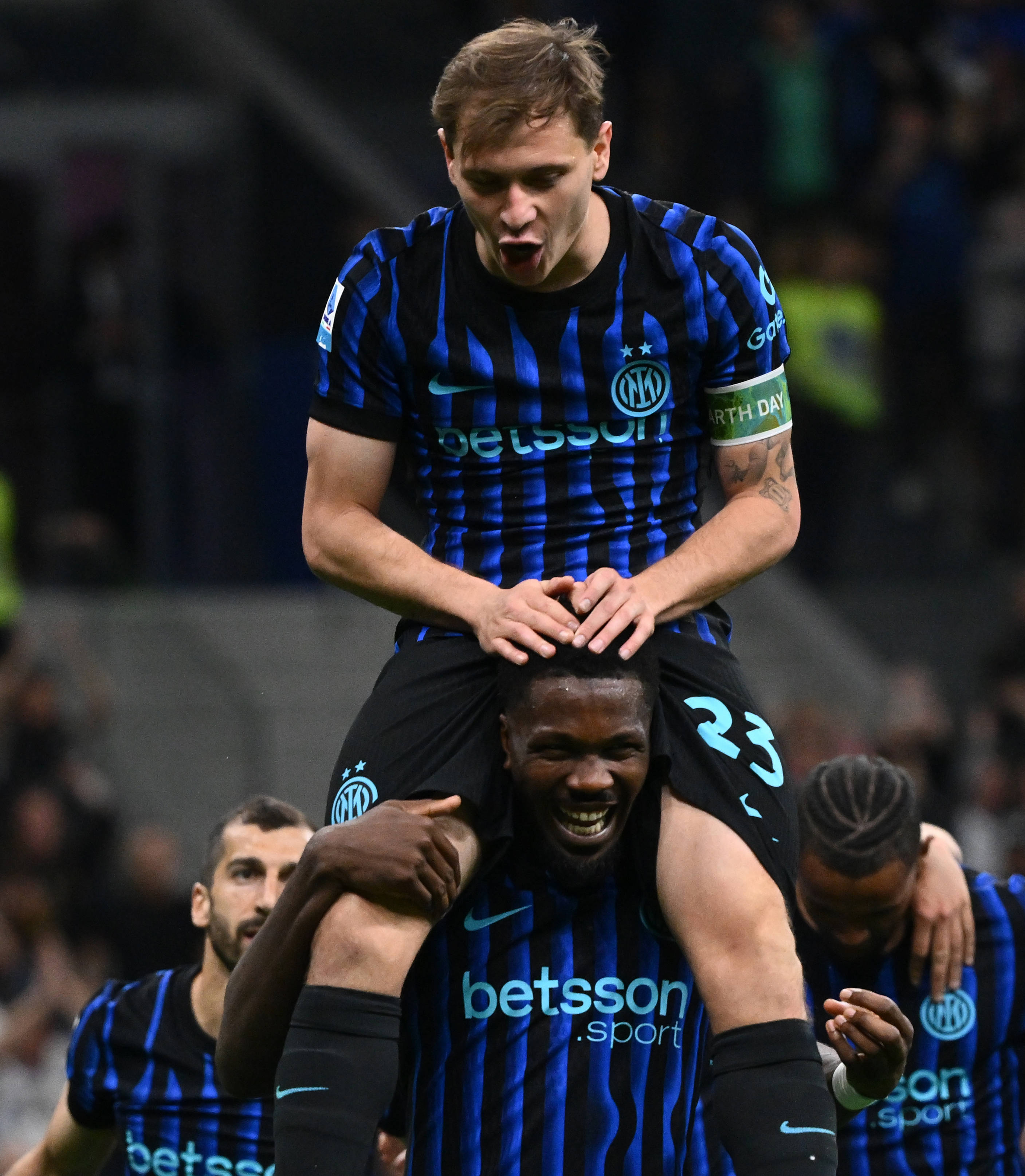 4月17日,国际米兰队球员巴雷拉(上)与队友图拉姆庆祝进球。 新华社发(阿尔贝托·林格利亚摄)