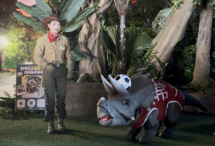 夜幕下的中华恐龙园灯火璀璨。这个诞生于2000年的老牌IP,始终进化着自己的“叙事方式”。如今,乐园里又添新玩法——“大小朋友快看,这是我们的明星‘角角’,谁想和它来一场足球对战?”工作人员热情邀请游客,与身披苏超常州队球服的机械恐龙互动踢球,引得欢笑连连。去年,在苏超常州队对阵南京队的比赛中,“恐龙啦啦队”的小恐龙“角角”累倒在赛场边,意外出圈。抓住这一契机,中华恐龙园迅速强化IP记忆点,推出趣味表情包,围绕“角角”等形象开发近50款文创衍生品,创造近千万元营收。